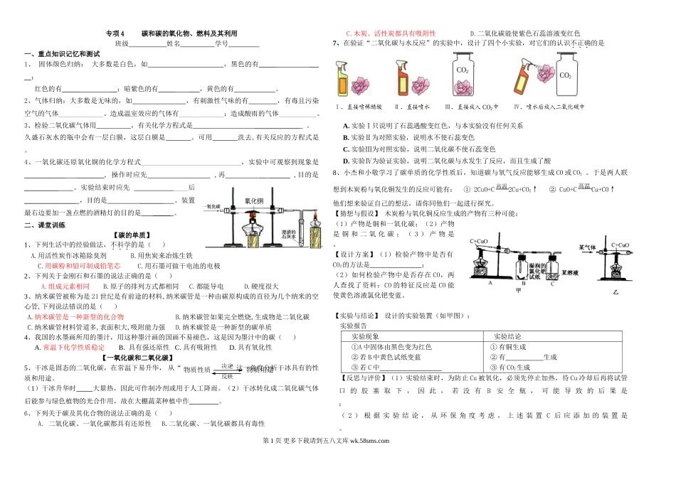 物质性质物质用途反映决定专项4碳和碳的氧化物、燃料及其利用班级姓名学号一、重点知识记忆和测试1、固体颜色归纳:大多数是白色,如,黑色的有__________;红色的有_______;暗紫色的有________,黄色的有。2、...