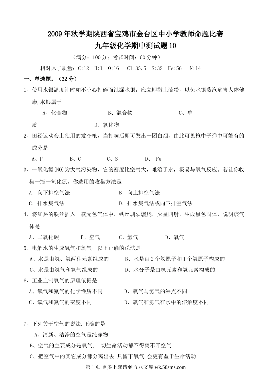 2009年秋学期陕西省宝鸡市金台区中小学教师命题比赛九年级化学期中测试题10(满分:100分;考试时间:60分钟)相对原子质量:C:12H:1O:16Cl:35.5S:32Fe:56N:14一、单选题。(32分)1、使用水银温度计时如不小心打...