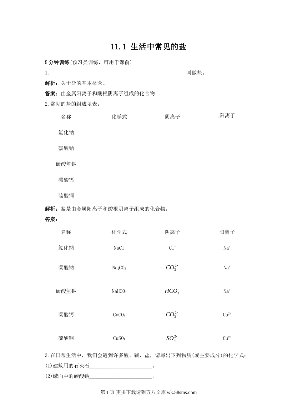 11.1生活中常见的盐5分钟训练(预习类训练,可用于课前)1.____________________________________________________叫做盐。解析:关于盐的基本概念。答案:由金属阳离子和酸根阴离子组成的化合物2.常见的盐的组成填...