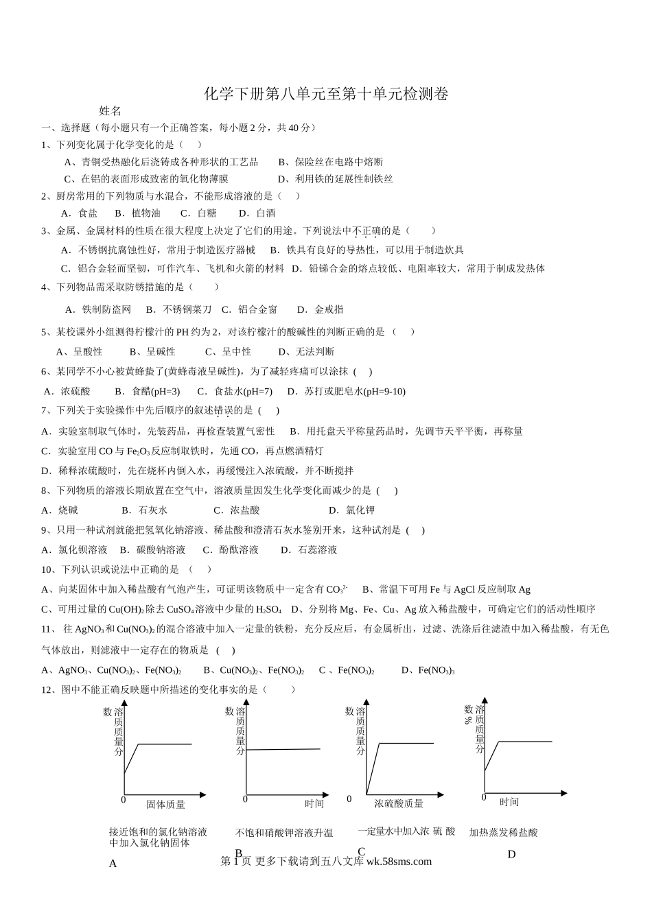 化学下册第八单元至第十单元检测卷姓名一、选择题(每小题只有一个正确答案,每小题2分,共40分)1、下列变化属于化学变化的是()A、青铜受热融化后浇铸成各种形状的工艺品B、保险丝在电路中熔断C、在铝的表面形...