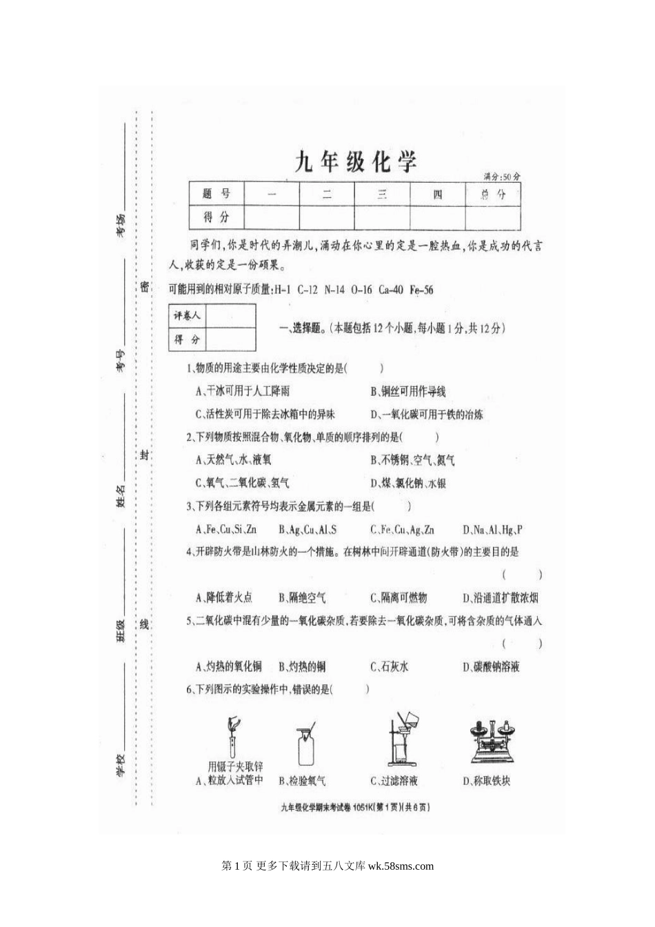 李埠口一中2015初三上学期期末化学考试卷及答案.doc_第1页