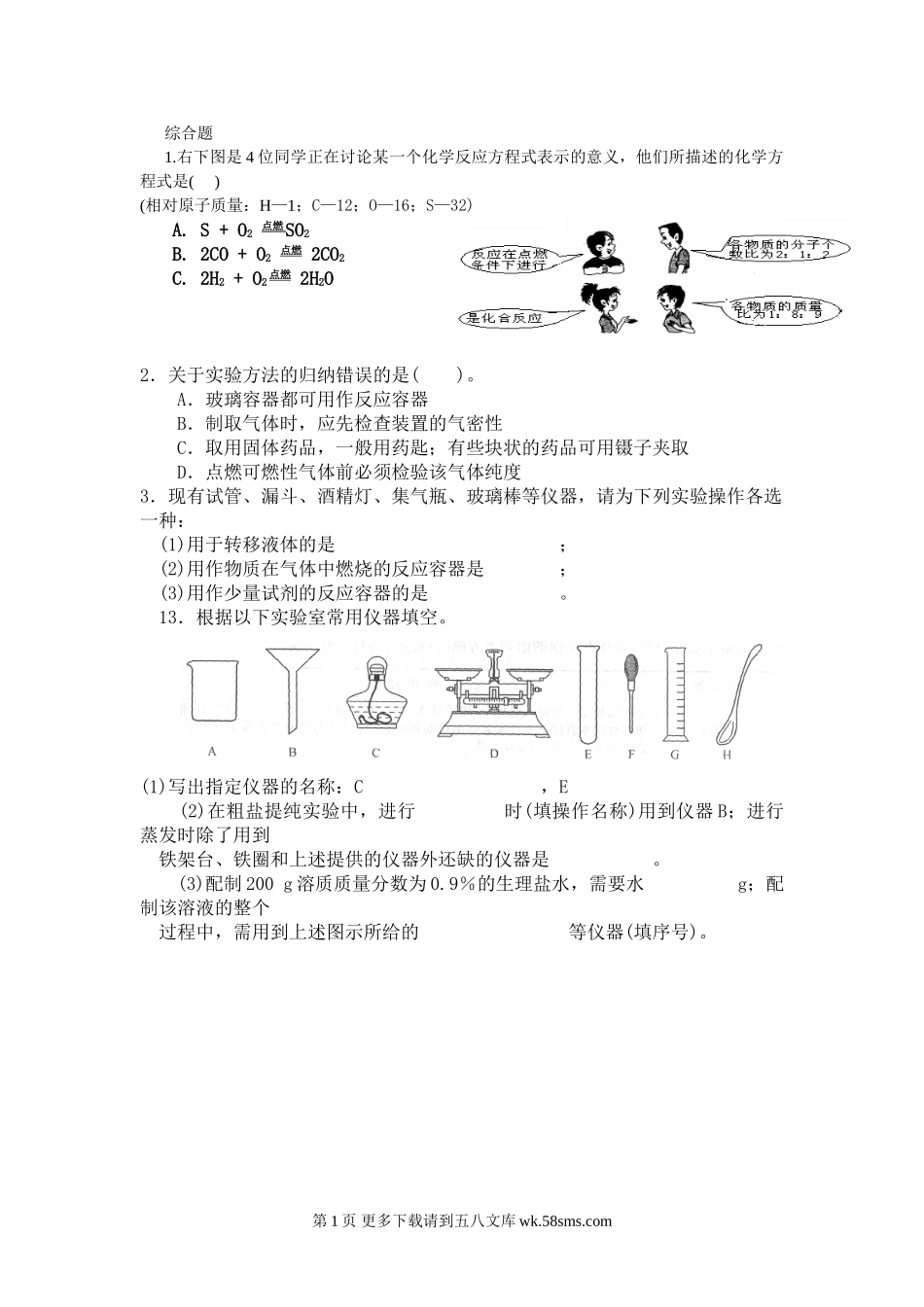 综合题1.右下图是4位同学正在讨论某一个化学反应方程式表示的意义,他们所描述的化学方程式是()(相对原子质量:H—1;C—12;O—16;S—32)A.S+O2点燃SO2B.2CO+O2点燃2CO2C.2H2+O2点燃2H2O2.关于实验方法的归纳...