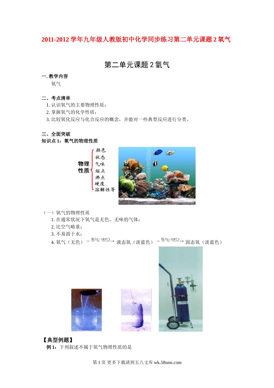 2011-2012学年九年级人教版初中化学同步练习第二单元课题2氧气第二单元课题2氧气一.教学内容氧气二、考点清单1.认识氧气的主要物理性质;2.掌握氧气的化学性质;3.比较氧化反应与化合反应的概念,并能对一些典型...