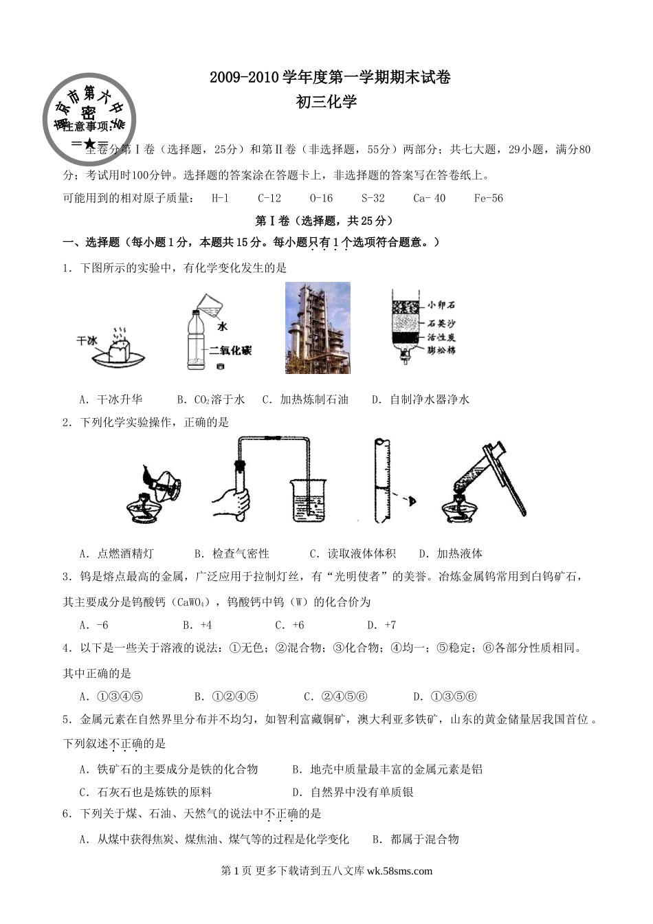 密=★=2009-2010学年度第一学期期末试卷初三化学注意事项:全卷分第Ⅰ卷(选择题,25分)和第Ⅱ卷(非选择题,55分)两部分;共七大题,29小题,满分80分;考试用时100分钟。选择题的答案涂在答题卡上,非选择...