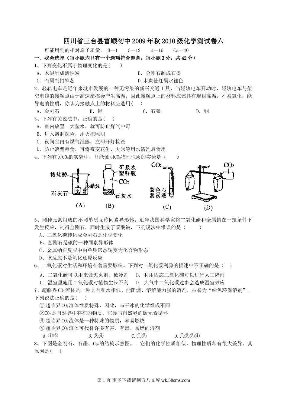 四川省三台县富顺初中2009年秋2010级化学测试卷六可能用到的相对原子质量:H—1C—12O—16Ca--40一、我会选择(每小题均只有一个选项符合题意,每小题3分,共42分)1、下列变化不属于物理变化的是()A.木炭制成活...