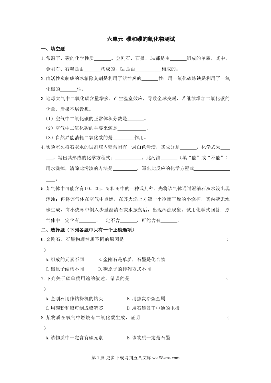 六单元碳和碳的氧化物测试一、填空题1.常温下,碳的化学性质_______。金刚石、石墨、C60都是由_______组成的单质,其中,金刚石、石墨是由_______构成的,C60是由___________构成的。2.由活性炭制成的冰箱除臭剂...