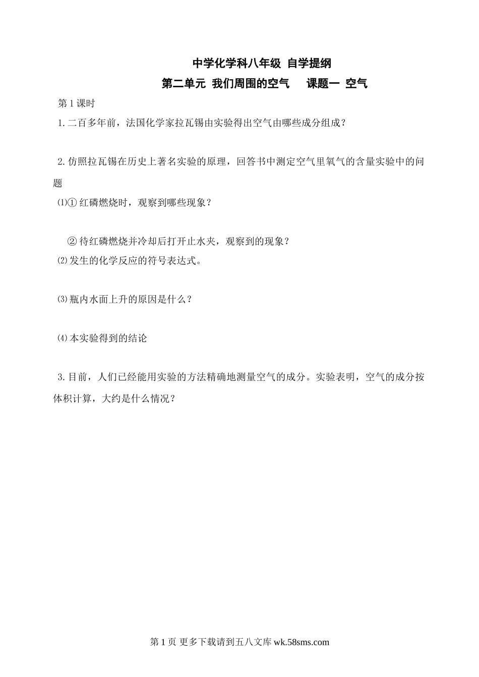 中学化学科八年级自学提纲第二单元我们周围的空气课题一空气第1课时1.二百多年前,法国化学家拉瓦锡由实验得出空气由哪些成分组成?2.仿照拉瓦锡在历史上著名实验的原理,回答书中测定空气里氧气的含量实验中的问...
