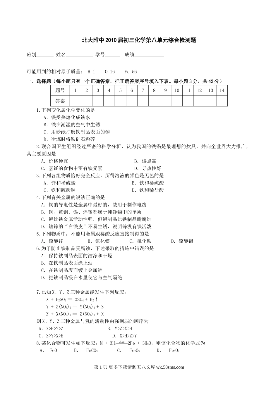 北大附中2010届初三化学第八单元综合检测题班别姓名学号成绩可能用到的相对原子质量:H1O16Fe56一、选择题(每小题只有一个正确答案,把正确答案序号填入下表。每小题3分,共42分)题号1234567891011121314答案1....