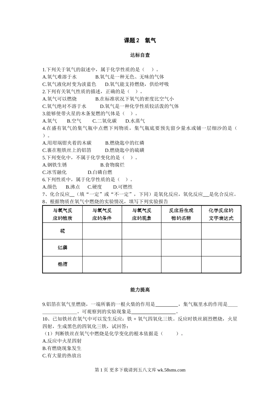 课题2氧气达标自查1.下列关于氧气的叙述中,属于化学性质的是()。A.氧气难溶于水B.氧气是一种无色、无味的气体C.氧气液化时变为淡蓝色D.氧气能支持燃烧,供给呼吸2.下列有关氧气性质的描述,正确的是()。A.氧...
