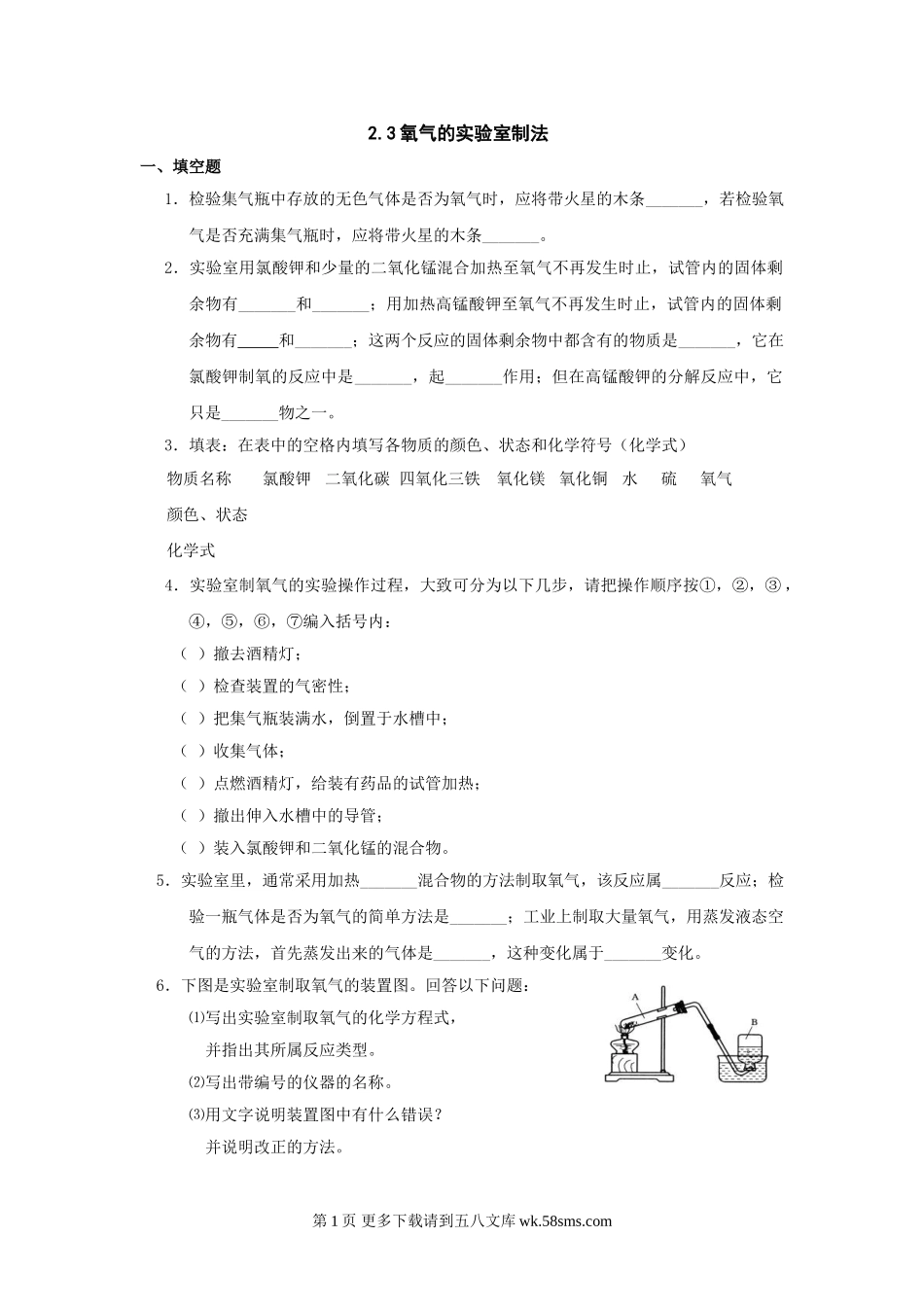 2.3氧气的实验室制法一、填空题1.检验集气瓶中存放的无色气体是否为氧气时,应将带火星的木条_______,若检验氧气是否充满集气瓶时,应将带火星的木条_______。2.实验室用氯酸钾和少量的二氧化锰混合加热至氧气...