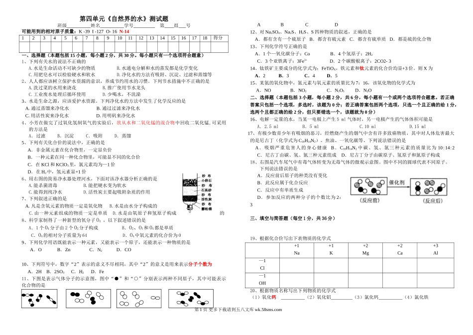 第四单元《自然界的水》测试题班级姓名学号第组号可能用到的相对原子质量:K-39I-127O-16N-14123456789101112131415161718得分一、选择题(本题包括15小题,每小题2分,共30分。每小题只有一个选项符合题意)1、...