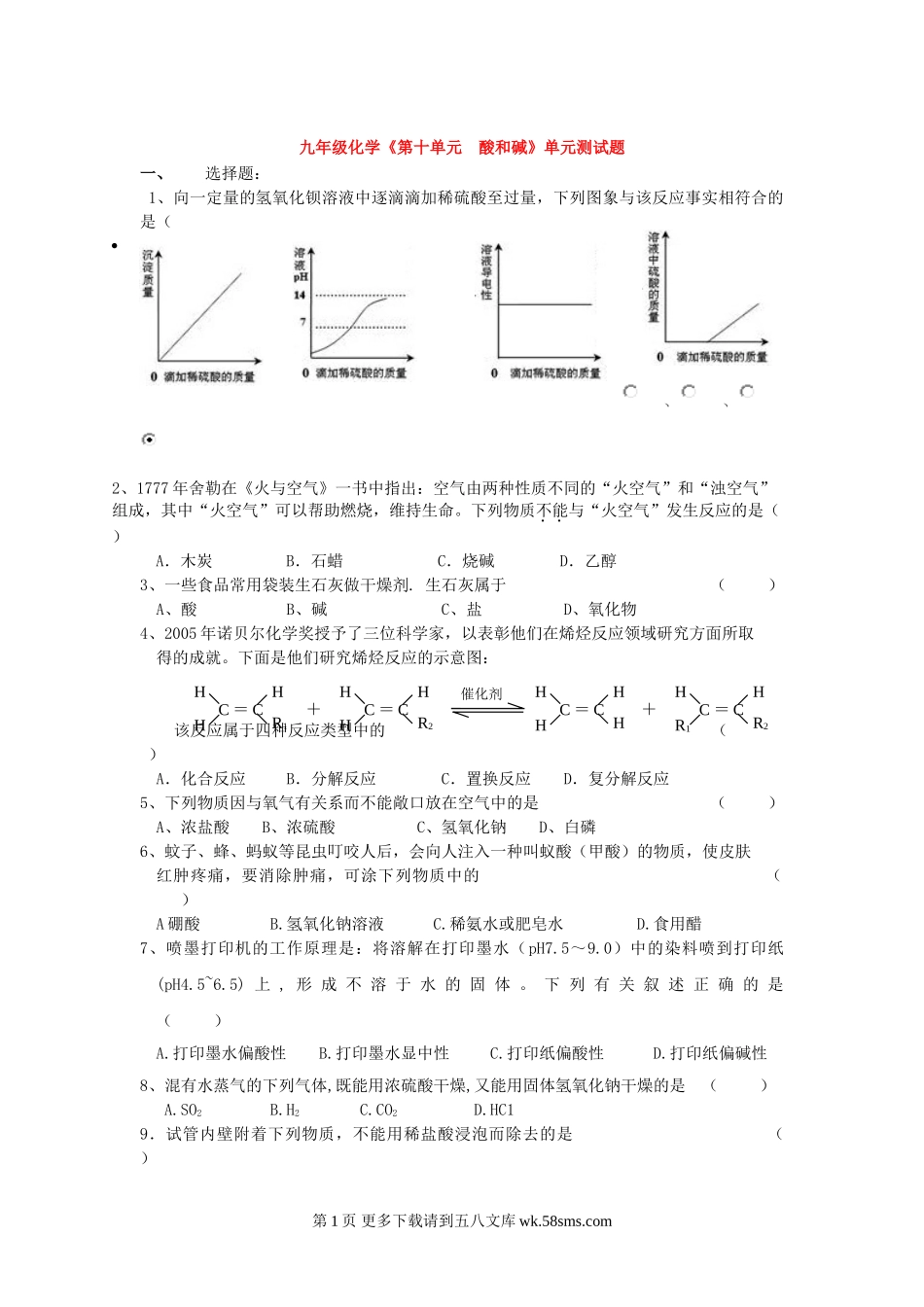 九年级化学《第十单元酸和碱》单元测试题一、选择题:1、向一定量的氢氧化钡溶液中逐滴滴加稀硫酸至过量,下列图象与该反应事实相符合的是(、、2、1777年舍勒在《火与空气》一书中指出:空气由两种性质不同的...