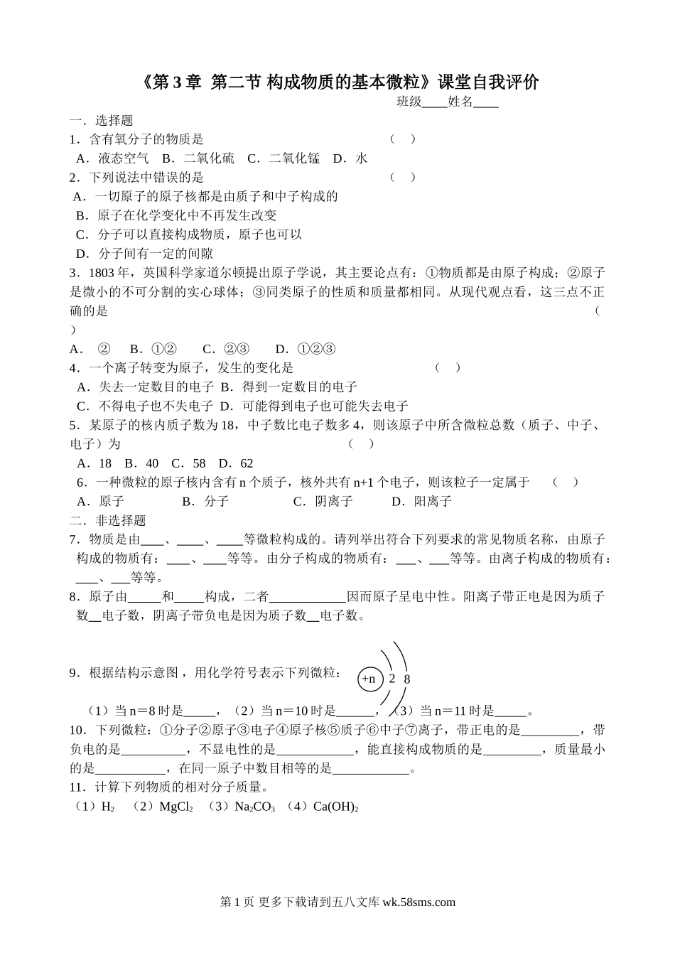 《第3章第二节构成物质的基本微粒》课堂自我评价班级姓名一.选择题1.含有氧分子的物质是()A.液态空气B.二氧化硫C.二氧化锰D.水2.下列说法中错误的是()A.一切原子的原子核都是由质子和中子构成的B.原...