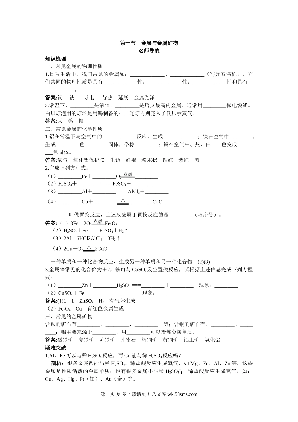 第一节金属与金属矿物名师导航知识梳理一、常见金属的物理性质1.日常生活中,我们常见的金属如:_____________、_____________(写元素名称),它们共同的物理性质是具有_____________性,_____________性,_____...
