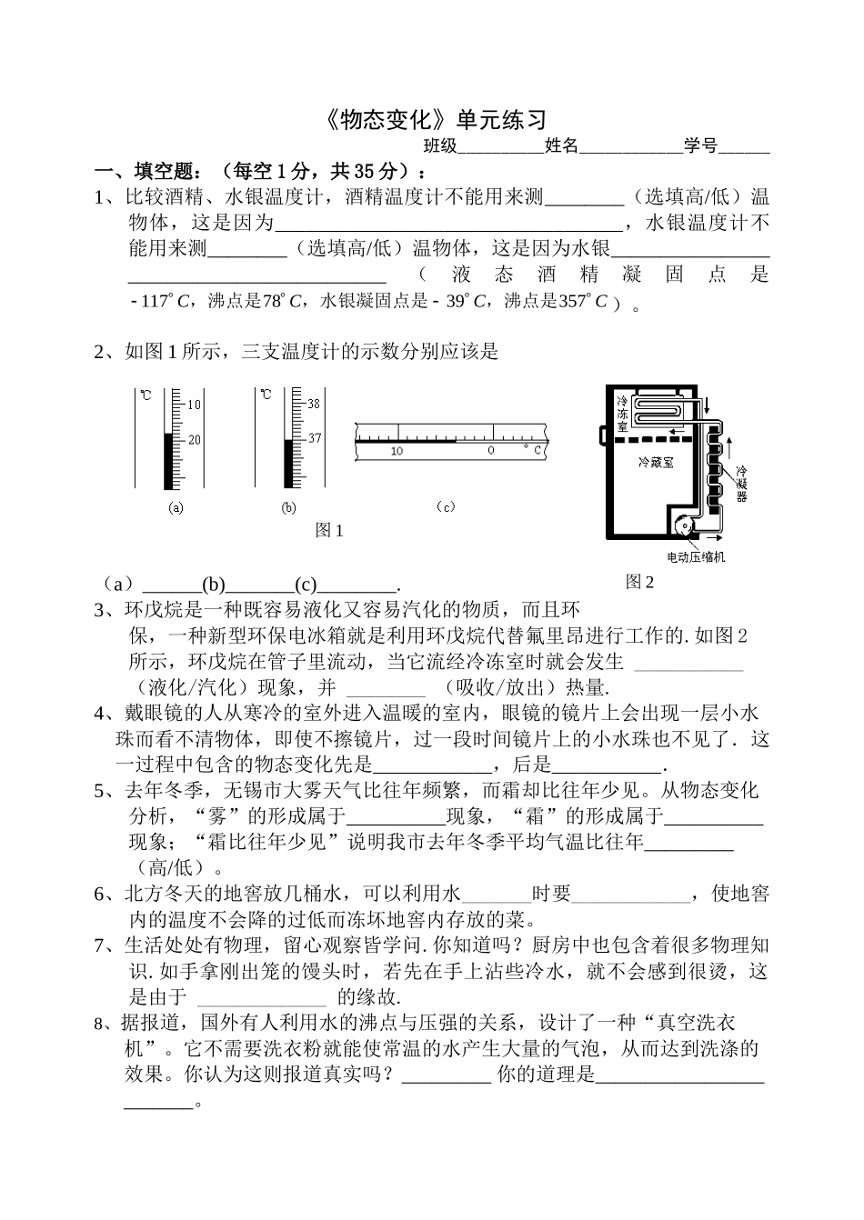 《物态变化》单元练习班级__________姓名____________学号______一、填空题:(每空1分,共35分):1、比较酒精、水银温度计,酒精温度计不能用来测________(选填高/低)温物体,这是因为______________________...