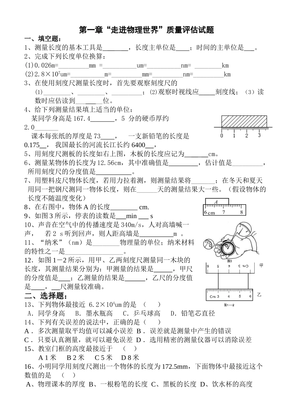 第一章“走进物理世界”质量评估试题一、填空题:1、测量长度的基本工具是____,长度主单位是;时间的主单位是_。2、完成下列长度单位换算:(1)0.026m=_________mm=__________um=__________nm=________km(2)2.8×...