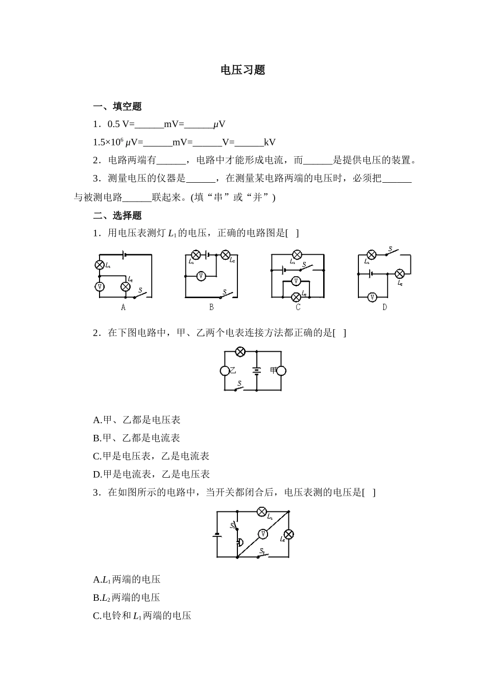 电压习题一、填空题1.0.5V=______mV=______μV1.5×106μV=______mV=______V=______kV2.电路两端有______,电路中才能形成电流,而______是提供电压的装置。3.测量电压的仪器是______,在测量某电路两端的电压...