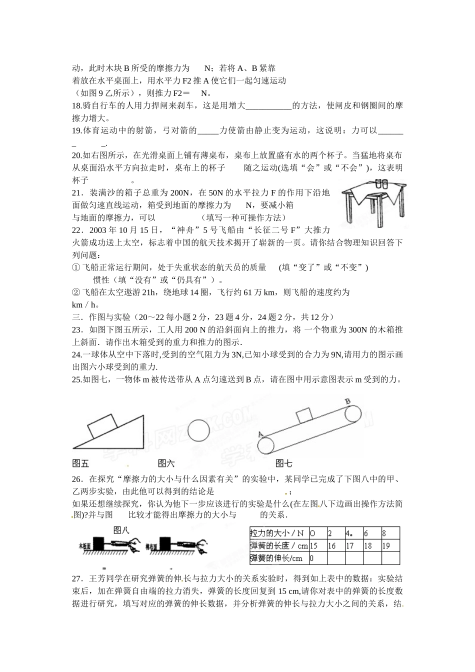 一.选择题:(每小题3分,共45分)1.日常生活中,下列估测最接近实际的是:A.自行车轮子的直径约为1.5mB.一棵大白菜的质量约为100gC.一名中学生的体重约为490ND.人步行的速度约为6m/s2.人们有时要利用惯...