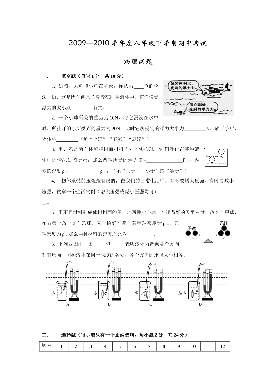 2009—2010学年度八年级下学期期中考试物理试题一.填空题(每空1分,共10分)1.如图,大鱼和小鱼在争论,你认为鱼的说法正确,这是因为两条鱼浸没在同种液体中,它们说受浮力的大小跟有关。2.一个小球所受的重力...