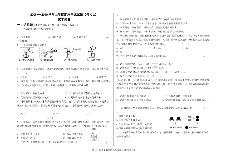 2009---2010学年上学期期末考试试题(模拟2)化学试卷一、选择题(本题包括12个小题,每小题1分,共12分)1、下列成语中只包含物理变化的是()A.沙里淘金B.刀耕火耨C.釜底抽薪D.百炼成钢2、下列实验操作正确...
