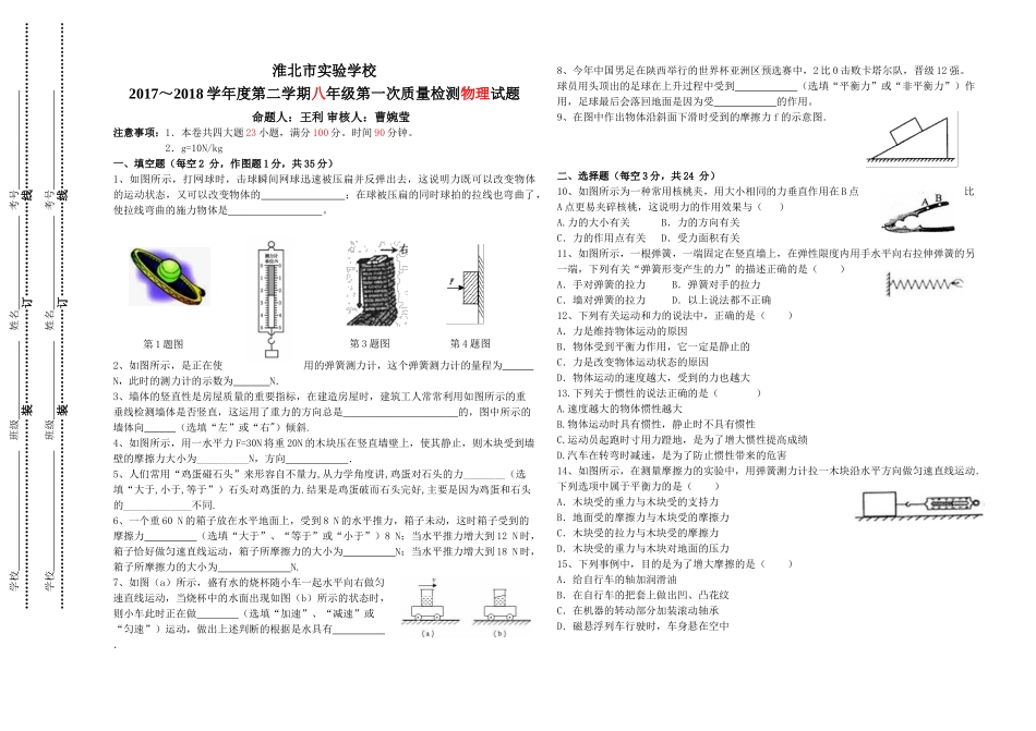 八年级物理初二物理淮北市实验学校2018年第二学期八年级物理第一次月考试卷.doc_第1页