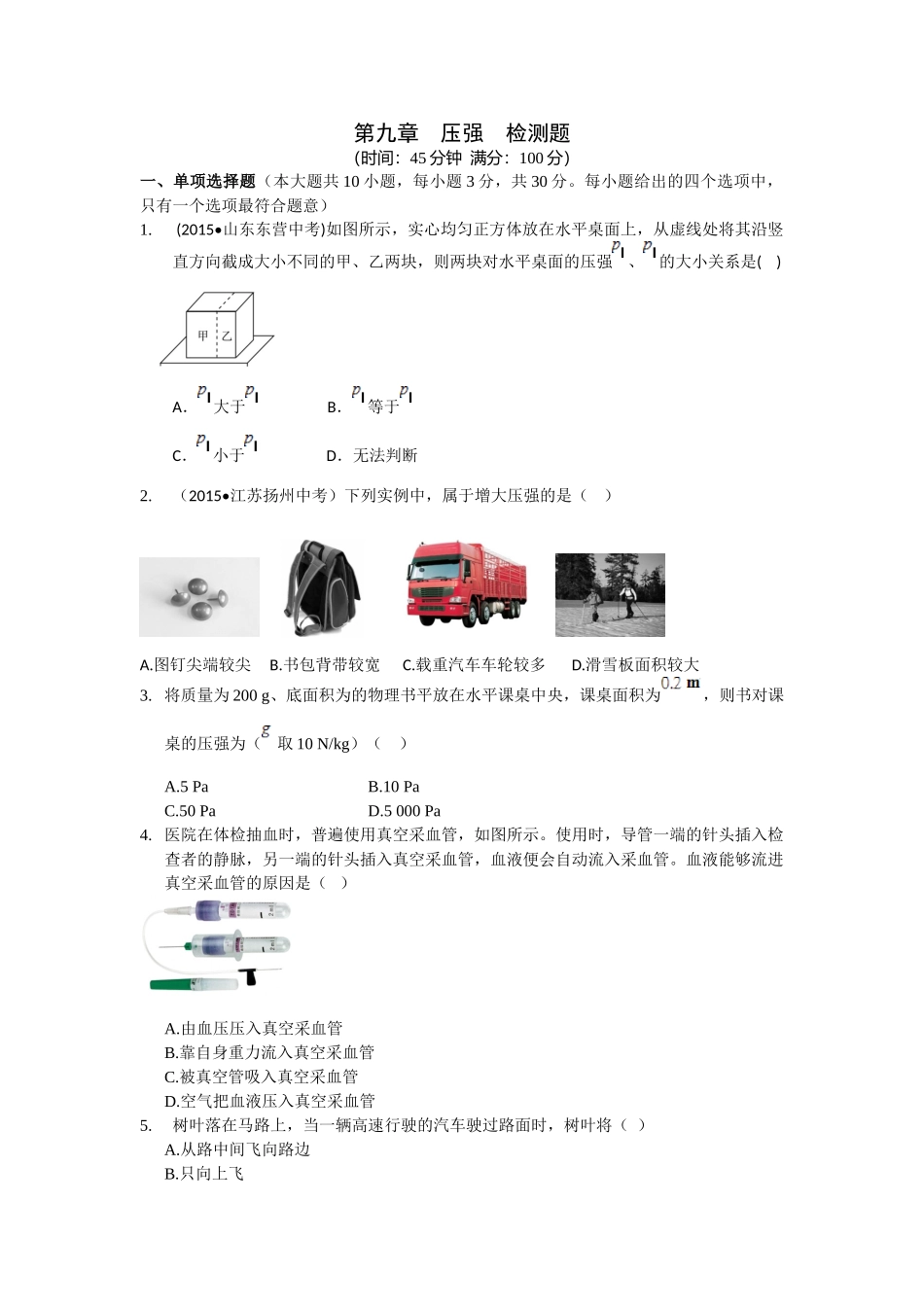 第九章压强检测题(时间:45分钟满分:100分)一、单项选择题(本大题共10小题,每小题3分,共30分。每小题给出的四个选项中,只有一个选项最符合题意)1.(2015•山东东营中考)如图所示,实心均匀正方体放在水平...