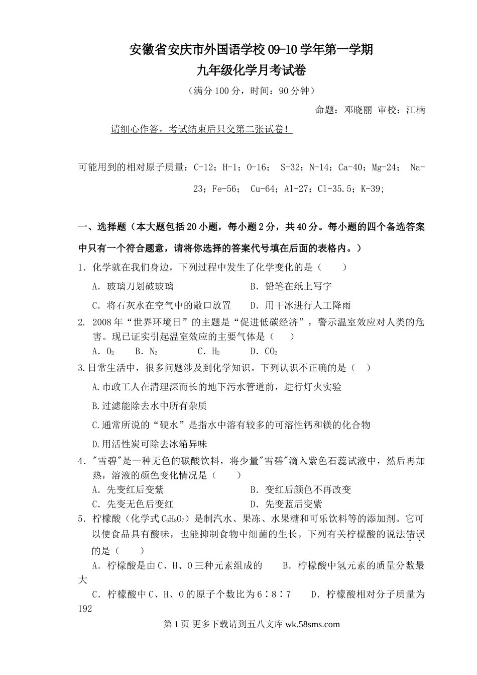 安徽省安庆市外国语学校09-10学年第一学期九年级化学月考试卷(满分100分,时间:90分钟)命题:邓晓丽审校:江楠请细心作答。考试结束后只交第二张试卷!可能用到的相对原子质量:C-12;H-1;O-16;S-32;N-14;...