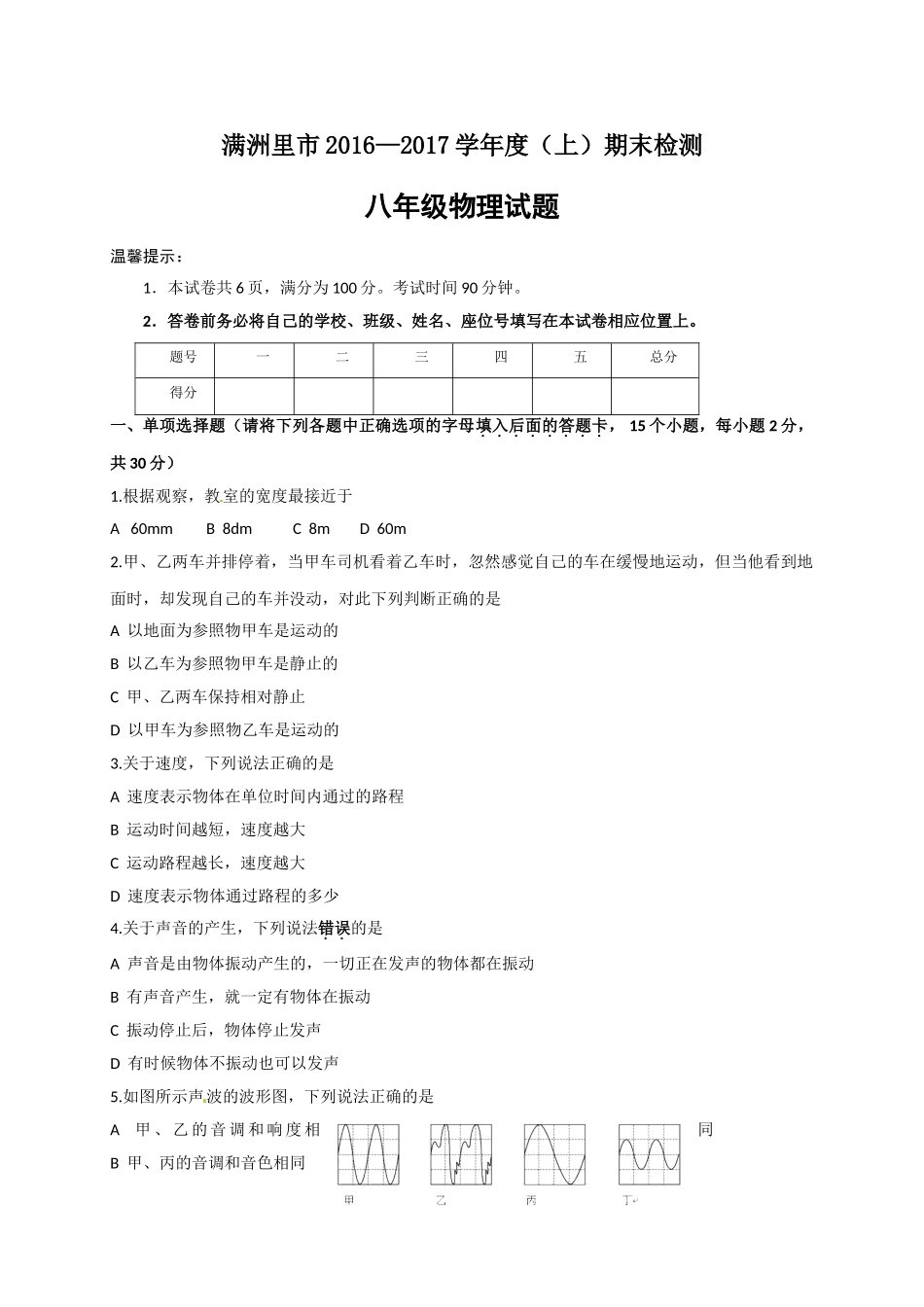 满洲里市2016—2017学年度(上)期末检测八年级物理试题温馨提示:1.本试卷共6页,满分为100分。考试时间90分钟。2.答卷前务必将自己的学校、班级、姓名、座位号填写在本试卷相应位置上。题号一二三四五总分得...