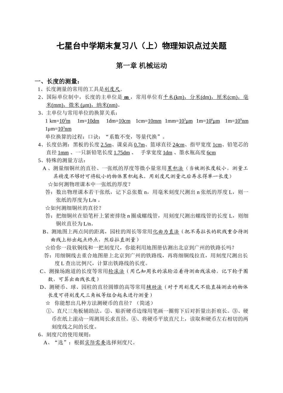 七星台中学期末复习八(上)物理知识点过关题第一章机械运动一、长度的测量:1、长度测量的常用的工具是刻度尺。2、国际单位制中,长度的主单位是m,常用单位有千米(km),分米(dm),厘米(cm),毫米(mm),微米(μm...