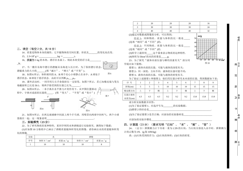 八年级物理期中学业水平检测(2009.4)(时间:60分钟满分100分)一、单项选择(每题3分,共36分)1、质量为1.2×105g的物体可能是().A.一头猪B.一只鸡C.一本书D.一头大象2、一块冰熔化后().A.质量和体积...