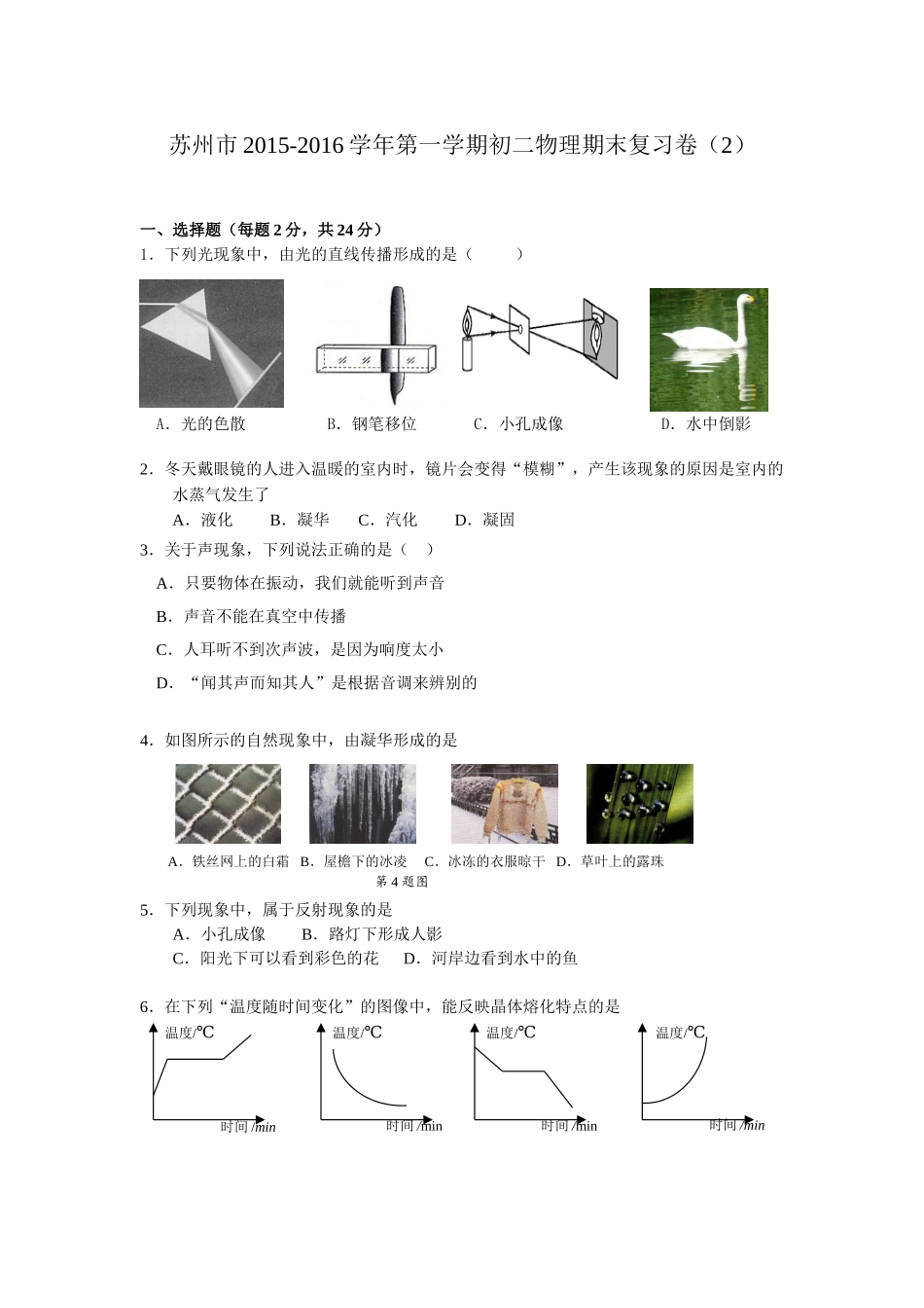 苏州市2015-2016学年第一学期初二物理期末复习卷(2)一、选择题(每题2分,共24分)1.下列光现象中,由光的直线传播形成的是()A.光的色散B.钢笔移位C.小孔成像D.水中倒影2.冬天戴眼镜的人进入温暖的室内...