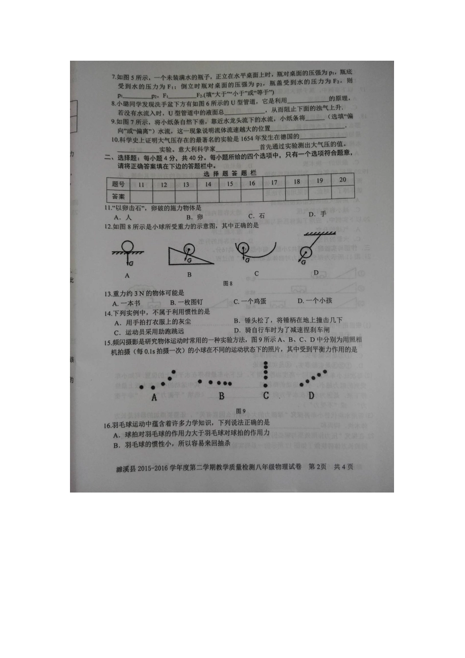 八年级物理初二物理濉溪县2016年八年级物理下学期期中试卷及答案.doc_第2页