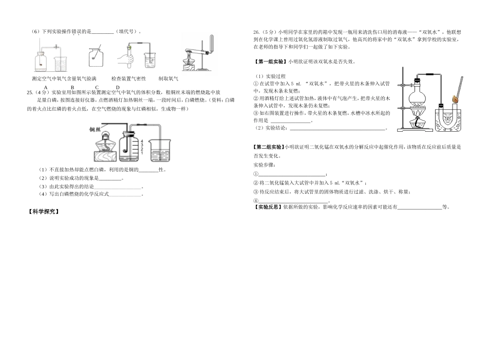 2018-2019第二学期初二年级化学期中考试试卷班级_______姓名_______考场座位号_______第一部分选择题(共20分,每小题只有1个选项符合题意。每小题1分)1.通过实验测定了空气组成的科学家是A.门捷列夫B.达尔文C...