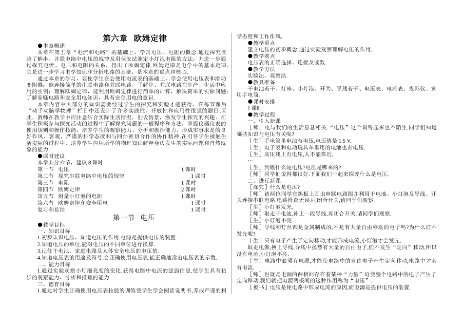 第六章欧姆定律●本章概述本章在第五章“电流和电路”的基础上,学习电压、电阻的概念.通过探究实验了解串、并联电路中电压的规律及用伏安法测定小灯泡电阻的方法,并进一步通过探究电流、电压和电阻的关系,得出...