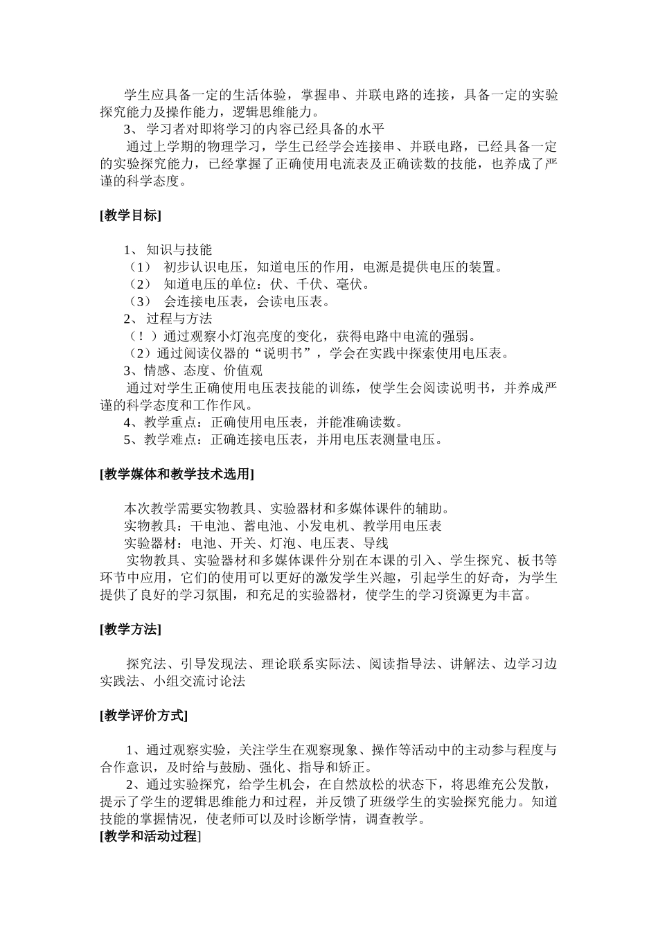 八年级物理下册第六章电压电阻第一节“电压”教学设计[学习任务分析]本节主要内容由“电压”、“电压表”组成。编者的实施建议是使学生通过实例认识电压、电压单位;使学生通过阅读“直流电压表使用说明书”知道...