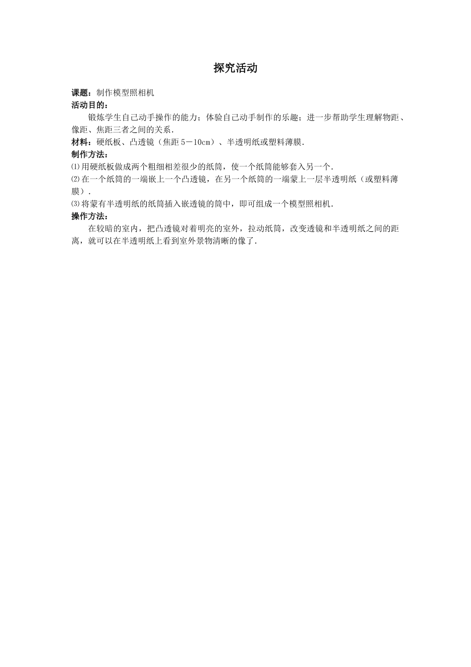 探究活动课题:学看照相机说明书活动目的:通过学看照相机说明书,学会在理解仪器工作条件和操作要求的前提下,按照说明书的要求正确的操作仪器.活动指导:⑴记录说明书上你认为有用的内容,并根据说明书的提示...