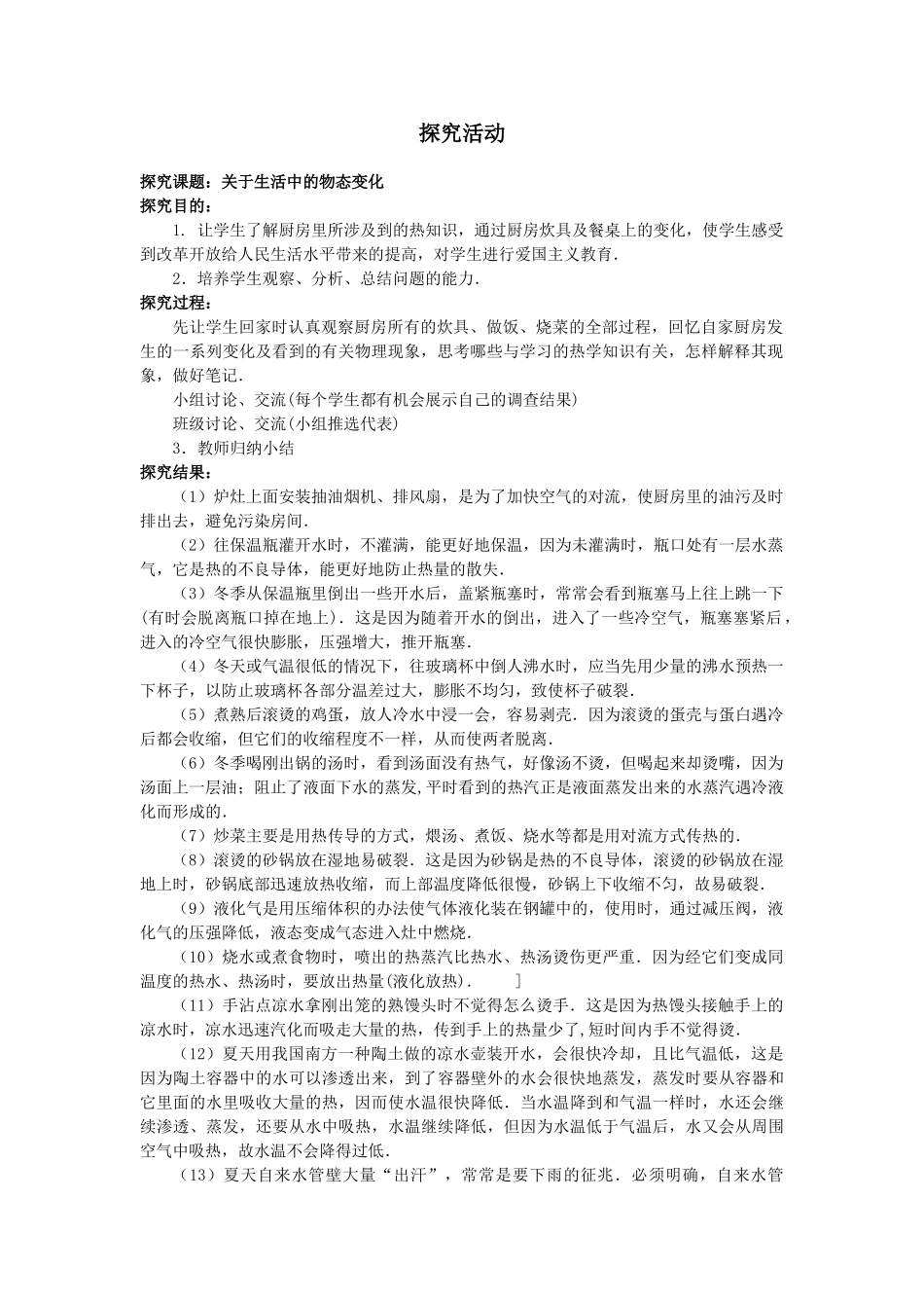 探究活动探究课题:关于生活中的物态变化探究目的:1.让学生了解厨房里所涉及到的热知识,通过厨房炊具及餐桌上的变化,使学生感受到改革开放给人民生活水平带来的提高,对学生进行爱国主义教育.2.培养学生观察...