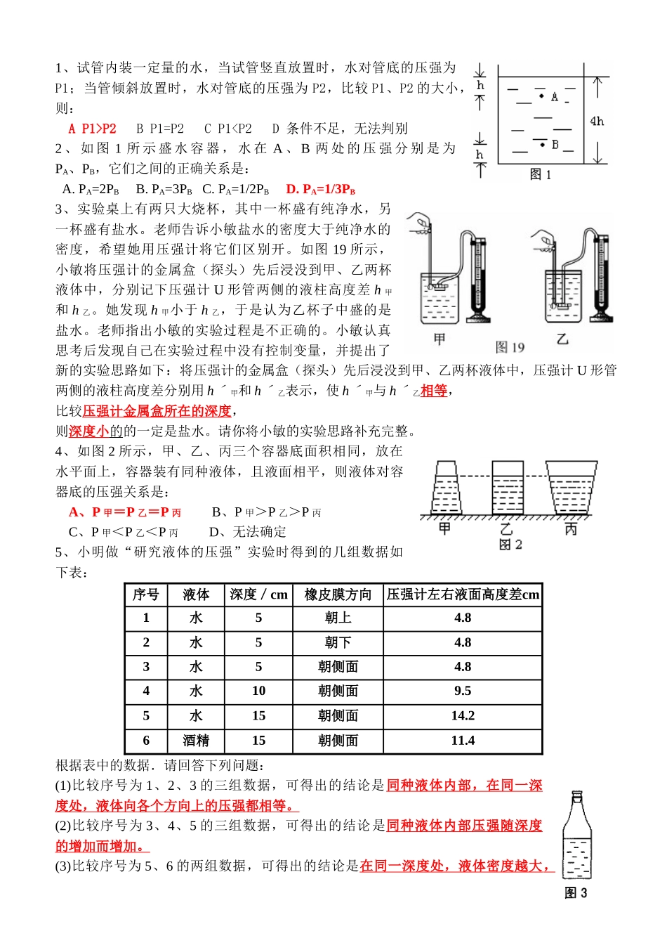 1、试管内装一定量的水,当试管竖直放置时,水对管底的压强为P1;当管倾斜放置时,水对管底的压强为P2,比较P1、P2的大小,则:AP1>P2BP1=P2CP1