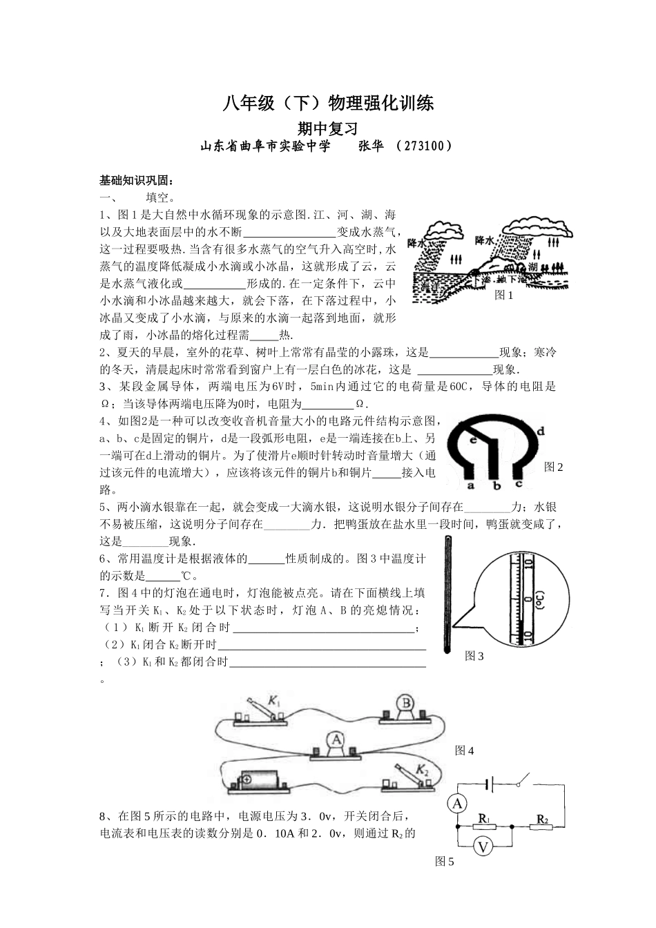 图1图2图3图4图5八年级(下)物理强化训练期中复习山东省曲阜市实验中学张华(273100)基础知识巩固:一、填空。1、图1是大自然中水循环现象的示意图.江、河、湖、海以及大地表面层中的水不断变成水蒸气,这一过...
