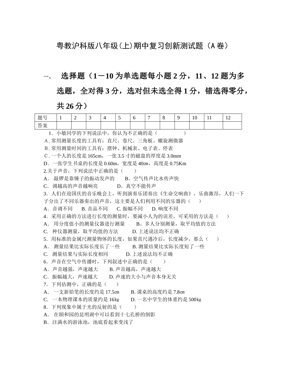 粤教沪科版八年级(上)期中复习创新测试题(A卷)一、选择题(1-10为单选题每小题2分,11、12题为多选题,全对得3分,选对但未选全得1分,错选得零分,共26分)题号123456789101112答案1.小敏同学的下列说法中,...