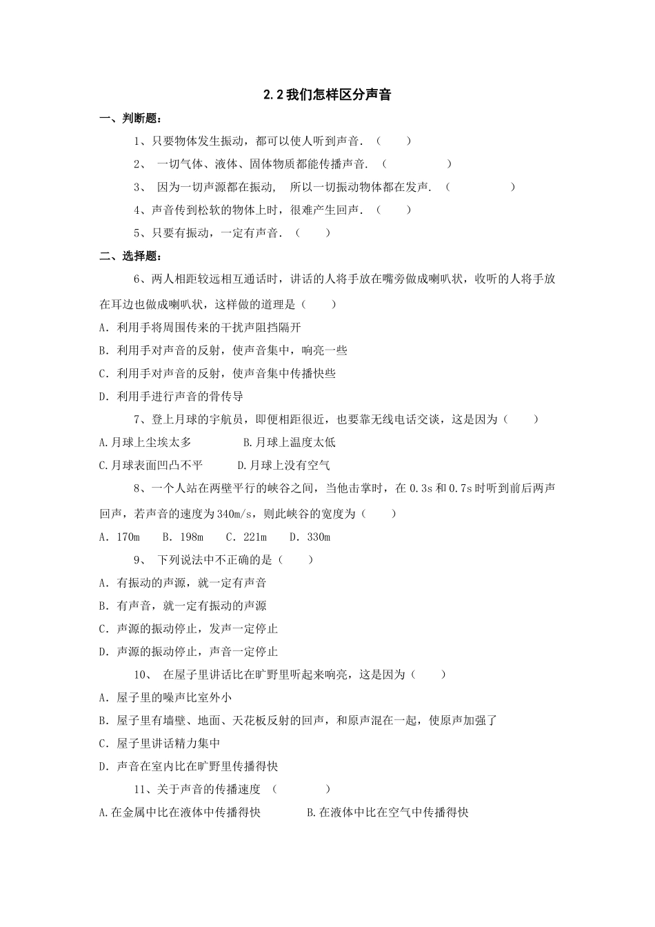 2.2我们怎样区分声音一、判断题:1、只要物体发生振动,都可以使人听到声音.()2、一切气体、液体、固体物质都能传播声音.()3、因为一切声源都在振动,所以一切振动物体都在发声.()4、声音传到松软的物体上...