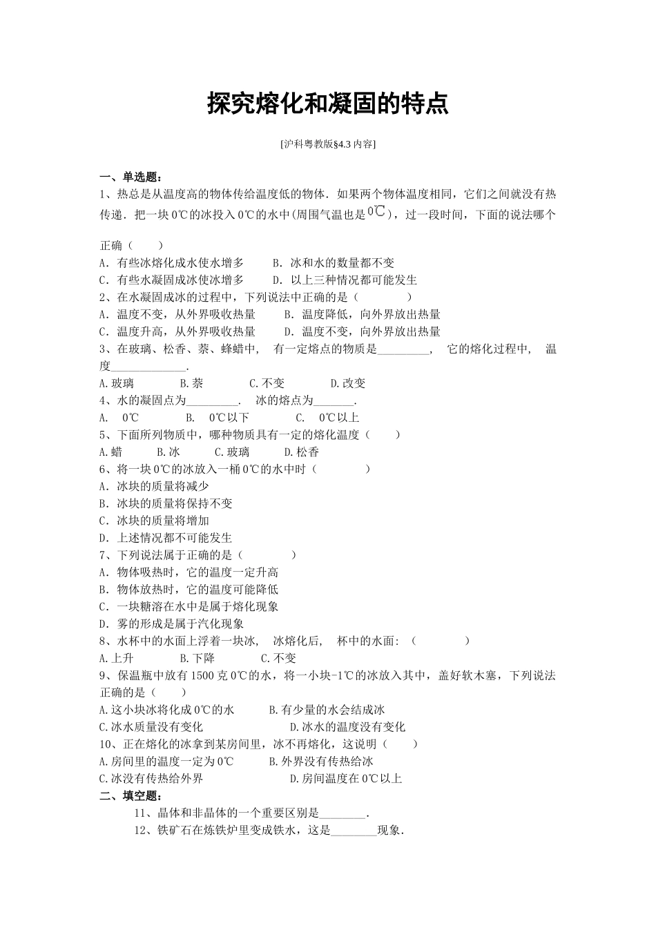 探究熔化和凝固的特点[沪科粤教版§4.3内容]一、单选题:1、热总是从温度高的物体传给温度低的物体.如果两个物体温度相同,它们之间就没有热传递.把一块0℃的冰投入0℃的水中(周围气温也是),过一段时间,下面...