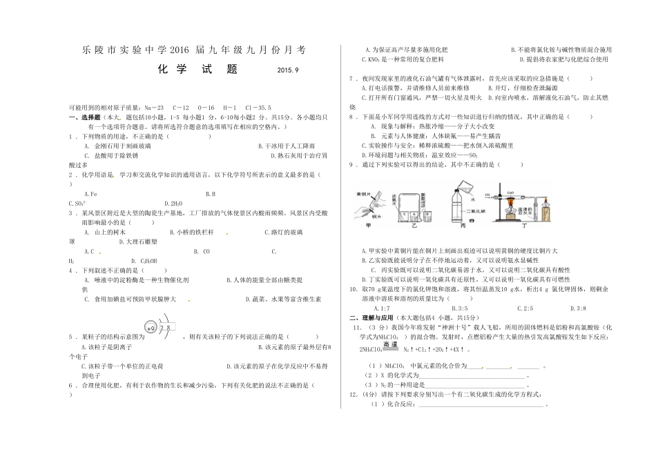 乐陵市实验中学2016届九年级九月份月考化学试题2015.9可能用到的相对原子质量:Na-23C-12O-16H-1Cl-35.5一、选择题(本大题包括10小题,1-5每小题1分,6-10每小题2分。共15分。各小题均只有一个选项符合题意...