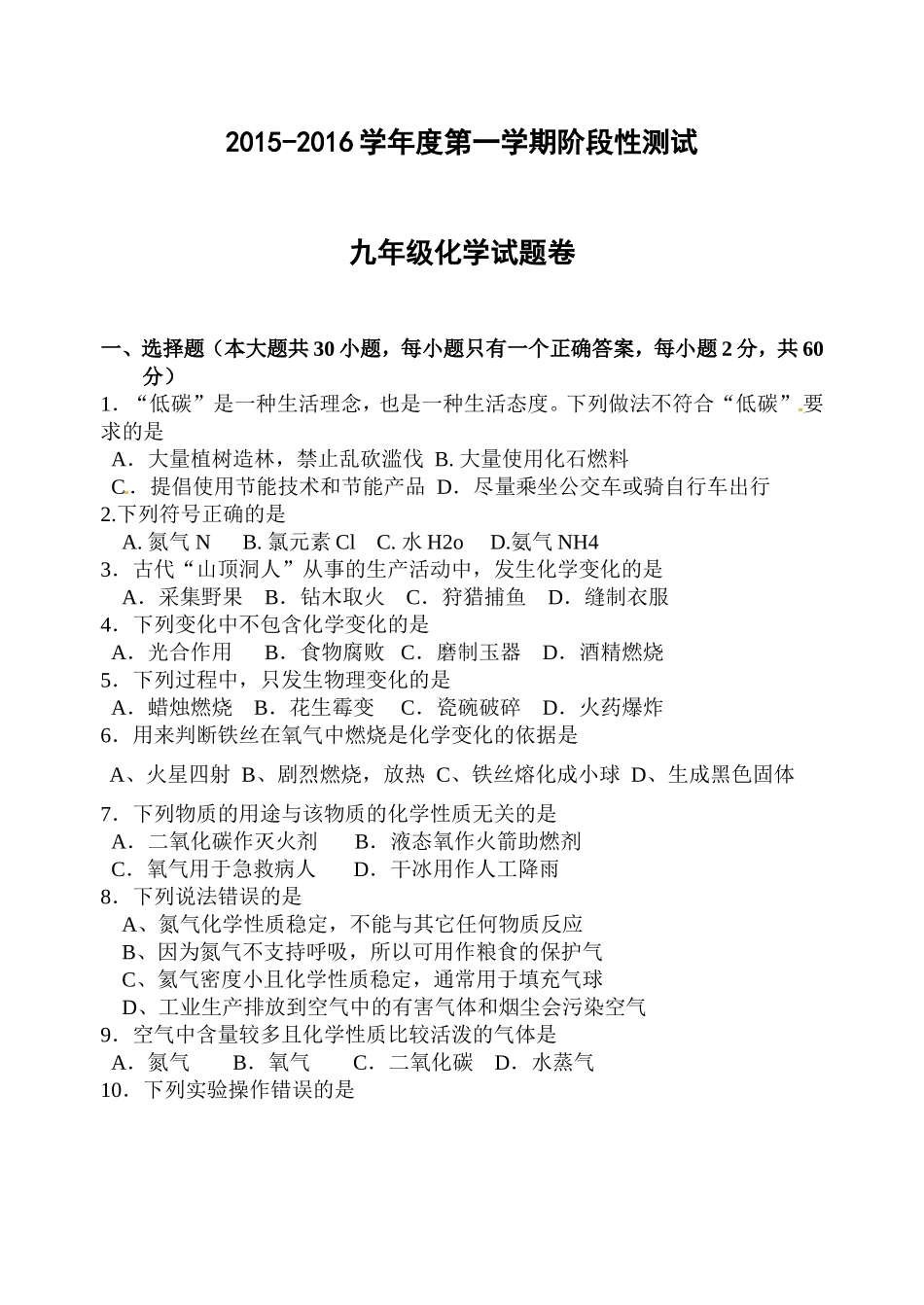 2015-2016学年度第一学期阶段性测试九年级化学试题卷一、选择题(本大题共30小题,每小题只有一个正确答案,每小题2分,共60分)1.“低碳”是一种生活理念,也是一种生活态度。下列做法不符合“低碳”要求的是A...