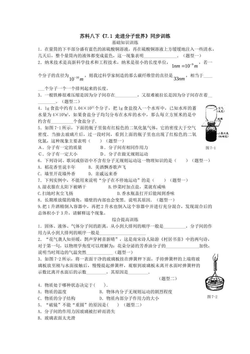 苏科八下《7.1走进分子世界》同步训练基础知识训练1.在量筒的下半部分盛有蓝色的浓硫酸铜溶液,再在硫酸铜溶液上方缓缓地注入一些清水,几天后,整个量筒内的液体都变成蓝色,这一现象表明_______________.(题...