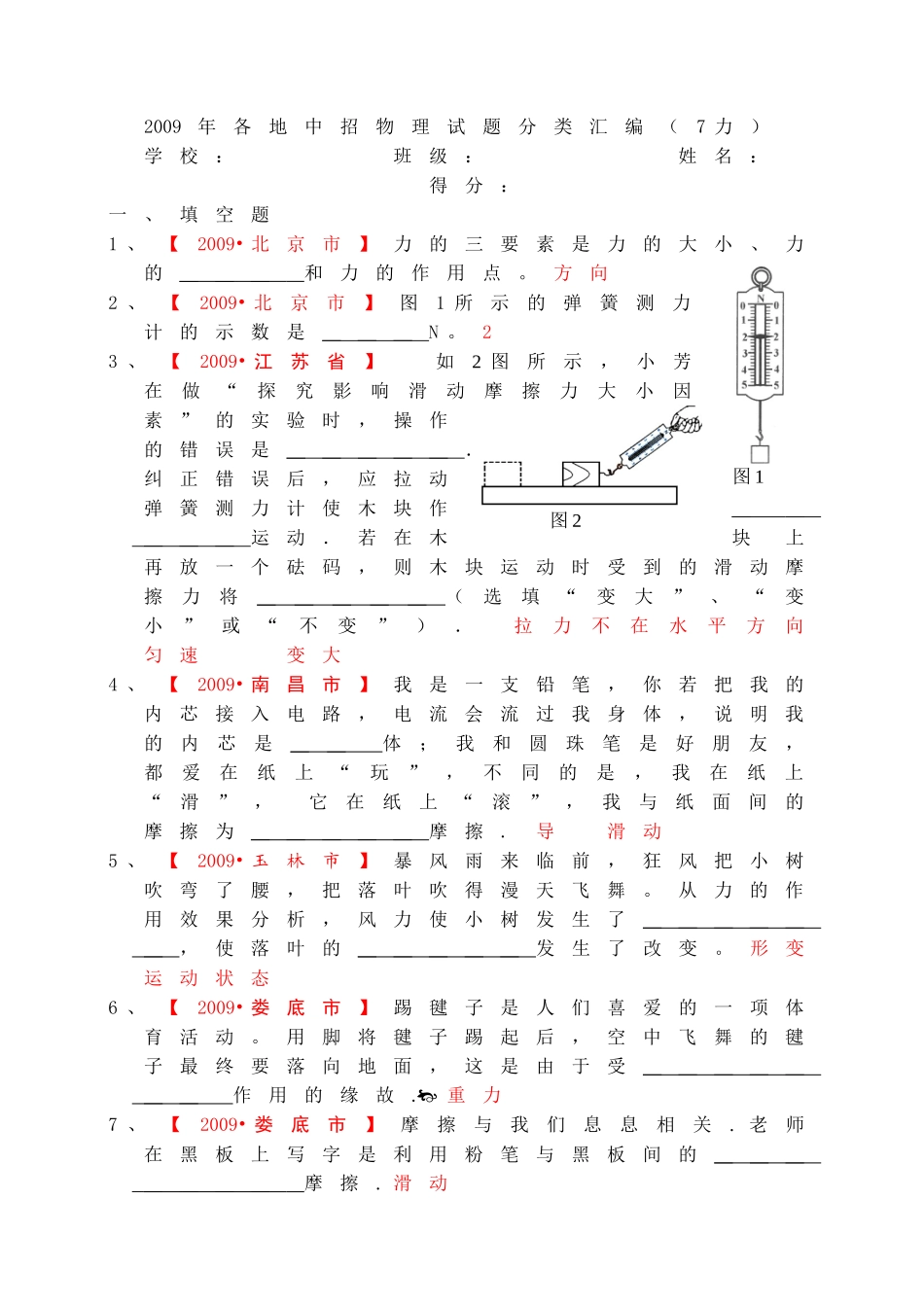 2009年各地中招物理试题分类汇编(7力)学校:班级:姓名:得分:一、填空题1、【2009•北京市】力的三要素是力的大小、力的___和力的作用点。方向2、【2009•北京市】图1所示的弹簧测力计的示数是___N。23...