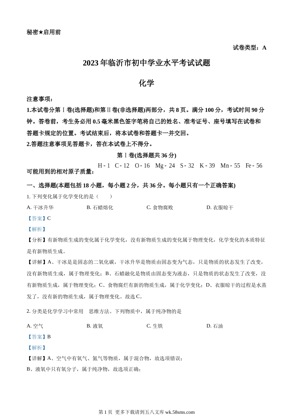 秘密★启用前试卷类型:A2023年临沂市初中学业水平考试试题化学注意事项:1.本试卷分第Ⅰ卷(选择题)和第Ⅱ卷(非选择题)两部分,共8页。满分100分,考试时间90分钟。答卷前,考生务必用0.5毫米黑色签字笔将自己的...