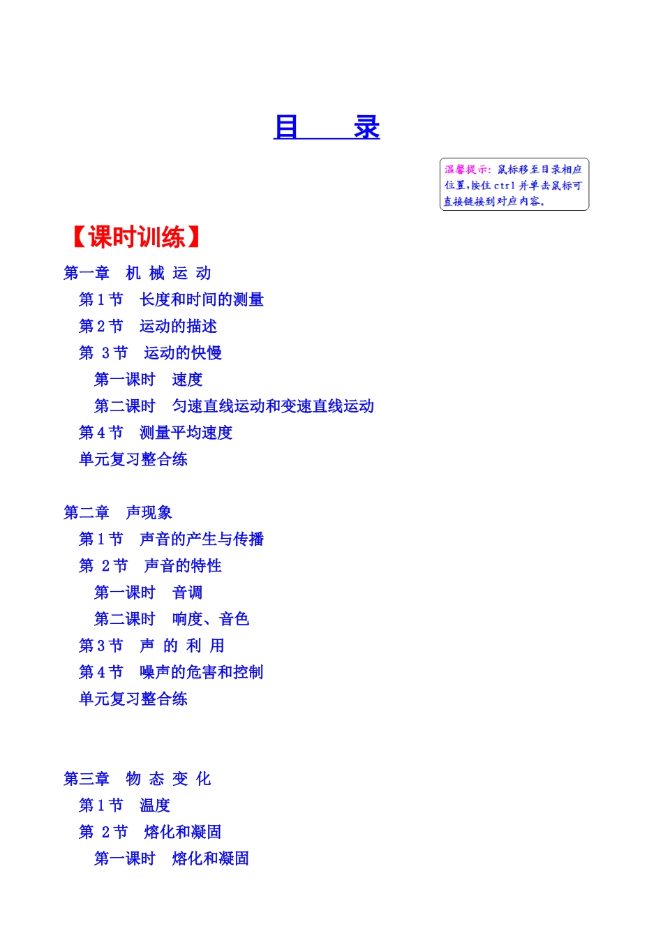目录【课时训练】第一章机械运动第1节长度和时间的测量第2节运动的描述第3节运动的快慢第一课时速度第二课时匀速直线运动和变速直线运动第4节测量平均速度单元复习整合练第二章声现象第1节声音的产生与传播第2节...