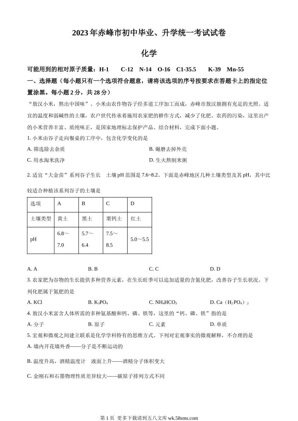 2023年赤峰市初中毕业、升学统一考试试卷化学可能用到的相对原子质量:H-1C-12N-14O-16C1-35.5K-39Mn-55一、选择题(每小题只有一个选项符合题意,请将该选项的序号按要求在答题卡上的指定位置涂黑。每小题2分,...