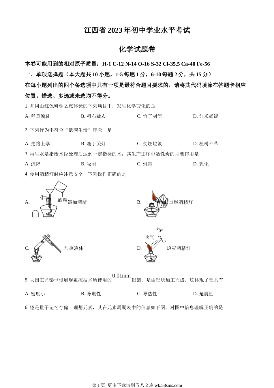 江西省2023年初中学业水平考试化学试题卷本卷可能用到的相对原子质量:H-1C-12N-14O-16S-32Cl-35.5Ca-40Fe-56一、单项选择题(本大题共10小题,1-5每题1分,6-10每题2分,共15分)在每小题列出的四个备选项中只有...
